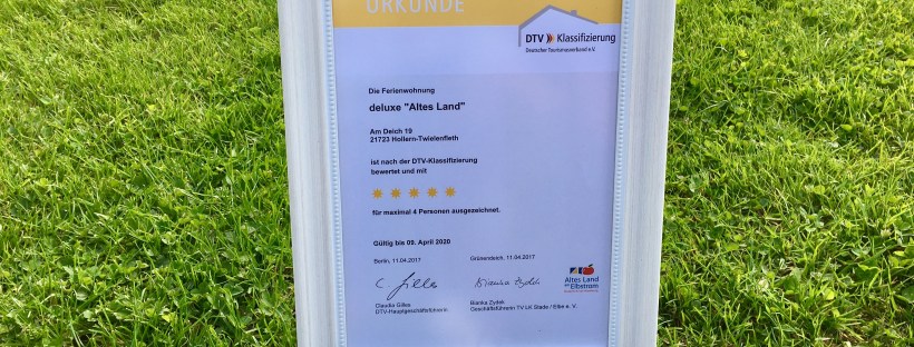 Vor kurzer Zeit erhielten wir dann unser DTV Klassifizierungsergebnis: 5 ***** S T E R N E. Darauf sind wir sehr stolz! Wir freuen uns, dazu beizutragen, eine weitere 5***** Ferienwohnung im Alten Land geschaffen zu haben und dem „Urlauben auf höchstem Niveau im Alten Land“ ein weiteres Gesicht zu geben. Als erste und einzige 5*****Ferienwohnung in Hollern-Twielenfleth, haben wir nun schon unsere ersten vier Gästefamilien empfangen dürfen und freuen uns auf unsere erste Saison, auch um Aufklärungsarbeit in Sachen Altes Land zu leisten – denn wir wohnen da, wo andere Urlaub machen und das hat seinen Grund.